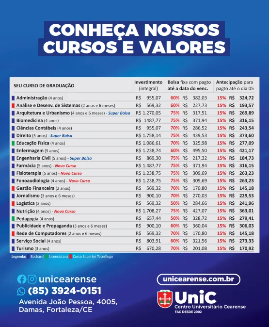 Garanta seu futuro com excelência! O maior e mais tradicional programa de bolsas de Fortaleza está com vagas abertas para 2026/1. Não perca a chance de transformar sua jornada acadêmica. Inscreva-se agora e dê o passo decisivo rumo ao sucesso profissional. Vagas limitadas – inscreva-se já!